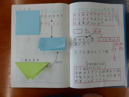 子どもたちとたくさん会話をしながら半分の表し方を考えました。
