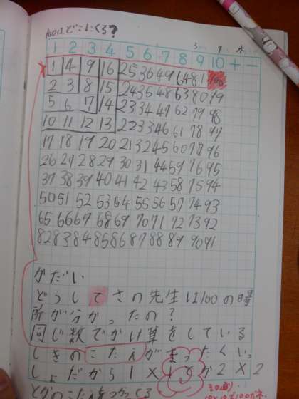 「先生の大予言です。ここに100がきます。さぁ、どうして先生は100の場所がすぐにわかったのかな?」
