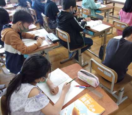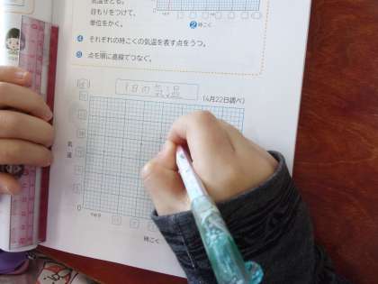 算数は、折れ線グラフの学習をしています。今日は、表の情報を折れ線グラフに表す学習です。まず、表題を書いて、次に横の軸の目盛りを書いて…と、順に取り組んでいきます。子どもたちは、「簡単だ。」と言いながら、すらすら解いています。しかし、いざ計算ドリルをすると、間違いがあったり分からなかったり…。いろいろな折れ線グラフを読み取ったり書いたりして、間違いなしを目指します。