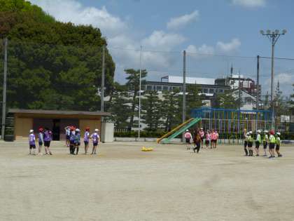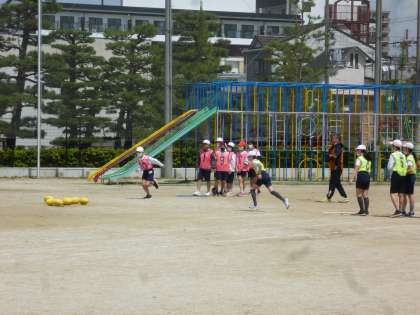 風が涼しく、気持ちの良い運動日和な日が続いています。体育科「体ほぐし運動」の様子です。チームに分かれてボールを取り合います。