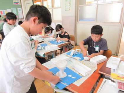 図画工作の学習で、粘土を切ったり、かきだしたり、引っ付けたりしながら作品を作りました。公園を表現したり、動物を作ったり、お菓子を作ったり、それぞれの思いを粘土で表現することができました。