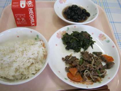栄養教諭:「給食の黒豆は,給食調理員さんが,みんなが元気に勉強できるように願って作ってくれはったんやで。」