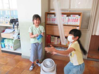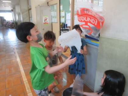 ビニール袋を使って、風にのせました。とても高くまで 上がったり横にとんだりと楽しく活動できました。