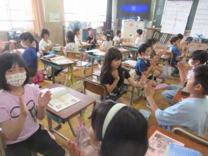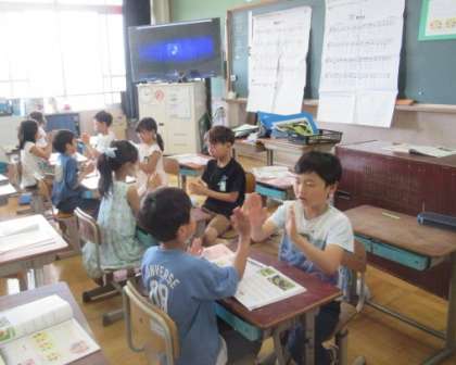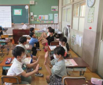 ♪夏も近づく〜 茶摘みの曲に合わせて手遊びをしています。「なかなか難しい!」「できたできた!」と楽しんでいました。