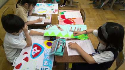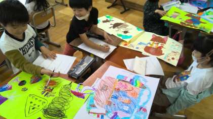 それぞれの絵の良さを見つけます。色の塗り方やたまごの割れ方の工夫など、一人一人が思いをもって作品を作っていました。
