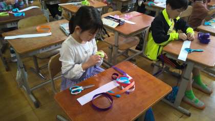 セロハンテープやのりを上手に使いながら、長くつなげたり、わっかを作ってつなげたり…子どもたちからいろいろなアイデアが出てきました!