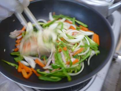 炒める料理「いろどり炒め」に挑戦します。フライパン料理にチャレンジします。ピーマン・玉ねぎ・にんじん・ハムを炒めます。同じ大きさに切り、強火で手早く炒めていきます。こげないように、みんなで協力しておいしいいろどり炒めができました。