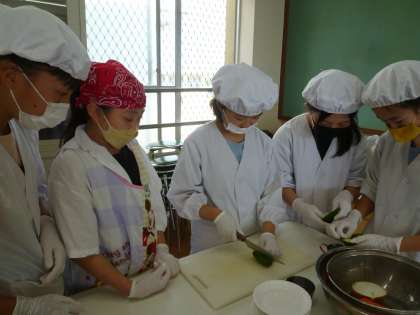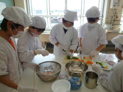 前回実習計画を立てたことをもとに、グループで「いろどり炒め」に取り組みます。この単元では、フライパンの使用の仕方について学習しました。残った油はふきとることや火を消した後もしばらく熱いので、冷ましてから洗うことなどを確認しました。火の通りにくいにんじんを先に炒め、強火で手早く炒めていきます。こげないように、混ぜながら、あっという間に完成しました。
