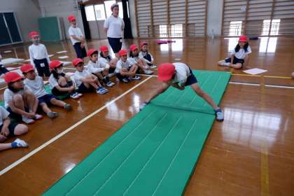 班の友だちとアドバイスをしあいながら、開脚前転や開脚後転、跳び前転などの新しい技に挑戦しています。