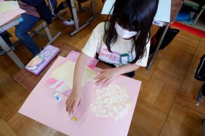 先週色をつけた和紙をちぎって貼り付けています。