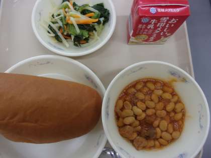 今日は、うまみたっぷりの【大豆】と【豚肉】があわさった「ポークビーンズ」でした。トマトケチャップやウスターソースなどを使って味つけしているので、子どもたちも食べやすい献立です。