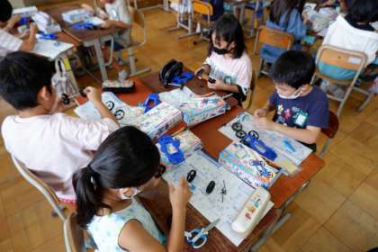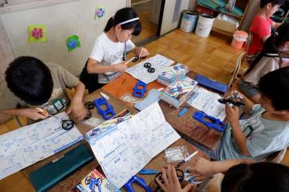 説明書を見ながら、班で協力しています。