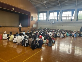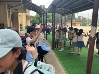 出発式の様子です。広島の天気が気になるところですが、元気に出発します。一年生や保護者の方がたくさん見送りに来てくれました。