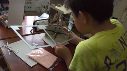 図画工作科の学習では、鏡の効果を使った立体作品を作ります!鏡に映すとどんな見え方がするのか調べました。