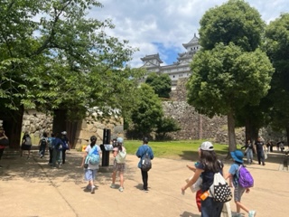 姫路城に到着です。グループで、天守閣まで登ります。別名白鷺城と言われるのも納得の美しさ。みんなで励まし合って登り、天守閣からの見事な景色を楽しみました。