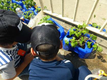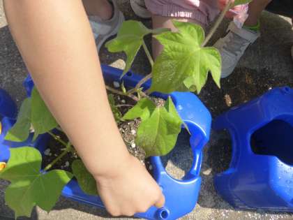 アサガオさんがぐんぐん育っているので、みんなで栄養(肥料)をあげにいきました。