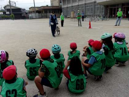 自転車教室がありました。警察の方から自転車の乗り方のポイントをしっかり聞いて、学校に作られたコースを走りました。思っていたよりも難しく、安全確認や止まる場所を覚えるのに精いっぱいの子どもたちです。チャレンジコースの細い道を15秒かけて走ることやジグザグコースは、悔しい顔をする子も多かったです。テストにどきどきしながら楽しみました。