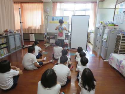 背骨・筋肉のはたらきを、体の中が見えるTシャツを着て、とても分かりやすく教えてくださりました。子どもたちもしっかり話を聞いていました。