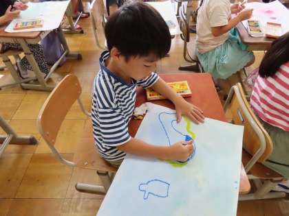 図工の学習で、物語を読んで想像したことを絵に表しています。