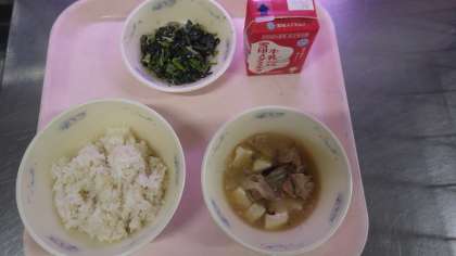 〇「ぶたにくととうふのくずに」は、しょうがの香りがして、ごはんととってもあっておいしかったです。「ほうれん草とじゃこのいためもの」は、いろどりもキレイでおいしかったです。これからもたくさんのきゅうしょくを楽しみにしています。(3年生)