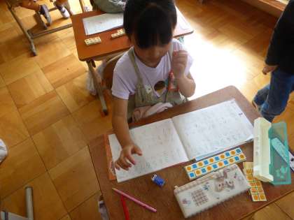 数図ブロックを操作しながらたし算の仕方を確かめ、自分の言葉で説明をします。