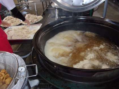 みんなに人気の「ヒレカツ」は、給食調理員さんが1枚1枚の肉に衣をつけて、サクッと揚げてくださいました。手作りのソースもよく合っていて、「おいしい」の感想がたくさん聞かれました!