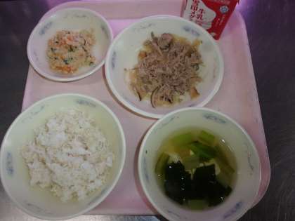 煮干しでとっただしと、油あげや青ねぎ、にんじんなどの彩り、甘みがおいしい一品でした。あまり「おから」になじみがない児童も、「おいしかった!」とぺろりと食べていました!