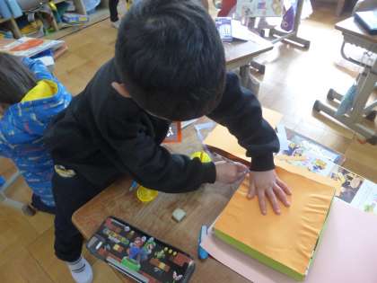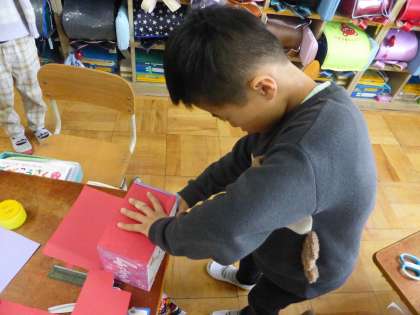 用意した箱に色画用紙を形通りに切取り、貼り合わせていきます。
