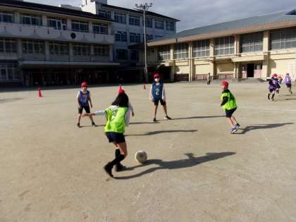 体育では、今、元気にサッカーをしています。全チームと総当たり戦を終えて、作戦会議にも熱が入ってきました。みんなで一気に攻めたり守ったりするどんどん行こう作戦や自分のゴールのところに居残り守る防御作戦など、友だちと話し合う中でチーム力も上げています。上手くいかなくても良い声かけができることを目標に頑張っています。