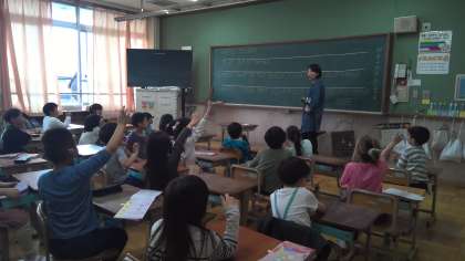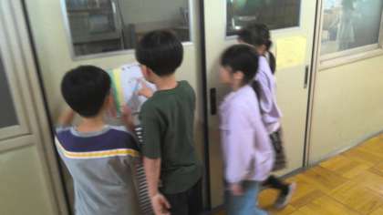 校内にはどんな教室があるのかを自分たちで歩き回って再確認し、担当に分かれてポスターを書きます。