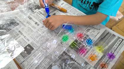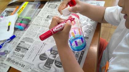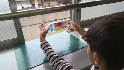 図画工作科の時間に光を通す透明の素材に、マーカーで色や模様を描きました。ただ色を塗るだけではなく、色を塗り重ねたり、模様を描いたりしながら工夫している姿がたくさん見られました。