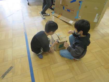 カッターやハサミを使って窓やドアを作ったり、テープを使ってカラフルにしたりと