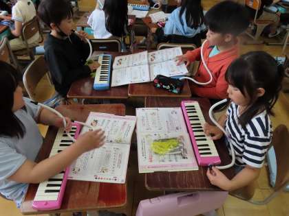 音楽の時間には、階名当てクイズをグループで行いました!リーダーが音符を指さし、リズムに合わせて「何の音?」と聞くと、みんなは鍵盤ハーモニカでその音を吹きます。楽譜上での音がドレミのどれなのか、分かるようになりました♪