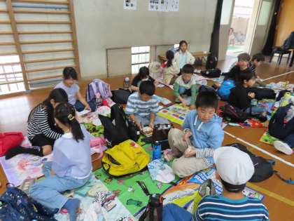 学校に帰って、みんなで体育館に集まってお弁当を食べました。お家の人が用意してくれたお弁当が、みんなの疲れた体に沁みます☆