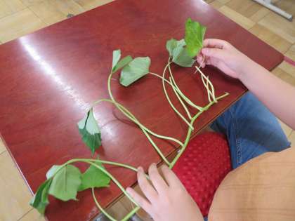 始めに教室で、サツマイモの苗を観察しました。