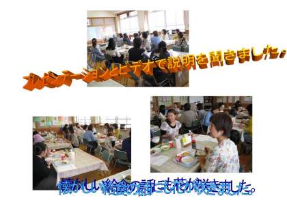 「学校給食と食育について」の話を聞いた後,各クラスの給食見学と実際に今日の給食を試食しました。