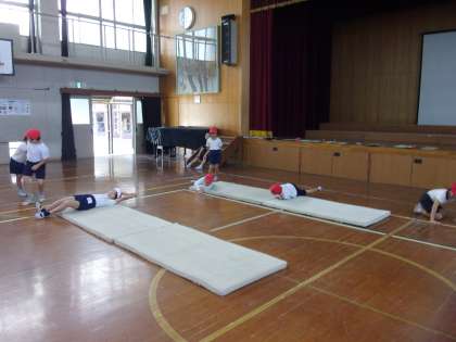 前転・後転ができるようになったり、やってみたら開脚前転や開脚後転が得意だと発見したり、側方倒立回転がきれいな友だちを見つけてみんなで見たり、少しずつできることが増えることが楽しいです。