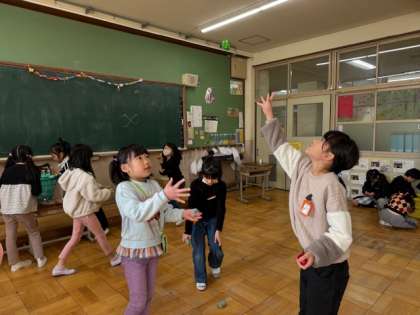 生活科の時間に、お正月遊びを楽しんでいます。やったことがあるものもないものも、友だちや先生にやり方を教えてもらいながら楽しんでいました。