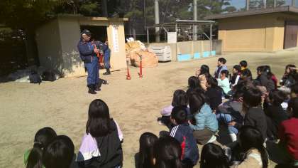 「伏見消防団 南浜分団 」の方に来て頂き、お話を聞きました。ワーキングルームで消防団の仕事や仕事に対する思いをお話頂いた後、消火器の使い方クイズをしました。運動場では、消防団の倉庫を見せて頂き、ホースや筒先も持たせてもらいました。地域の方に支えてもらっていることを実感した学習になりました。