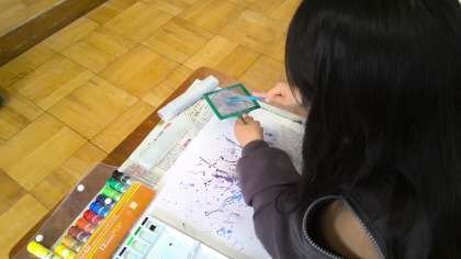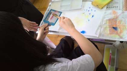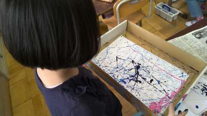 ビー玉を転がしたり、あみと歯ブラシを使ったり、画用紙を半分に折って対照的な模様をつくったりとできる模様を楽しみながら活動していました。