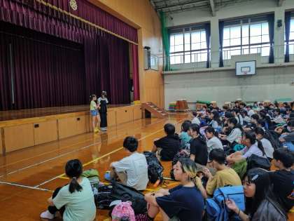 出発式を終えて、バスは目的地に向かって走っています。バスの車内は盛り上がっています。