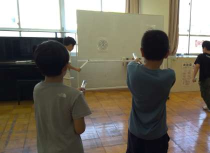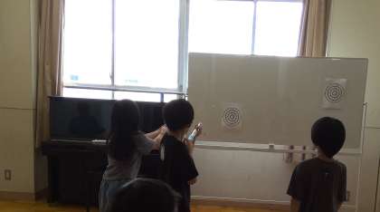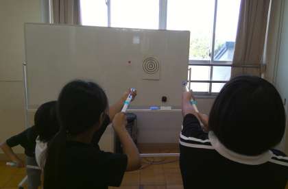 空気でっぽうを使ってスポンジ玉をとばしてみることから学習がスタートしました。