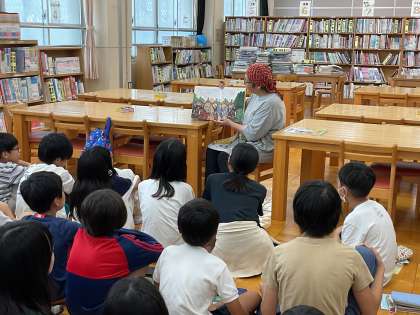5年生は、図書室で川田先生に読み聞かせをしてもらいました。