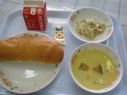 「今日のパンプキンチャウダーがおいしかったです。ぼくはとてもかぼちゃがすきなのでとてもれしかったです。コッペパンとツナサンドのぐとマヨネーズをはさんで食べたらすごくおいしかったです。また 作ってください。」・・・3ねんせい
