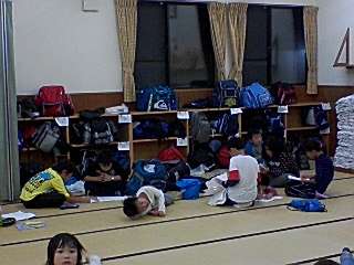 <楽しく肝試し!>怖くないけど楽しいとキャーキャー言いながら,チームで力を合わせて進んだ肝試しも終了です。外は,雲間からの見える星空はとってもきれいで,街中では見えない星も見えそうです。温度は,昼間と比べだいぶ涼しく過ごしやすそうです。この後は,今日の反省をして9時就寝予定です。今日は,雨に降られることもなく予定をこなすことができました。明日は,6時起床で,7時から朝の集いです。午前中は,グループごとにグランド遊び。午後は,浦山ラリーです。そして,夜はキャンプファイヤーの予定です。