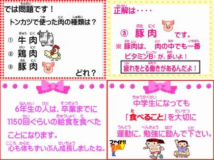 「今日のトンカツがとてもジューシーでおいしかったです。トンカツは1まい1まい心を込めて作っていたことを感じると,すごいと思いました。また,おいしい給食をたくさんつくってください!!」・・・5ねんせい