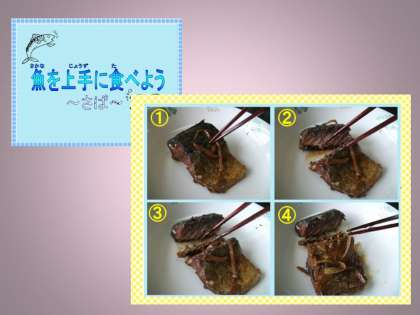 電子紙芝居「給食室からこんにちは」で,食べ方も紹介したことや,5月の「さばのしょうが煮」に引き続き今年度2回目ということもあって,骨を上手にとってしっかり食べることができました。