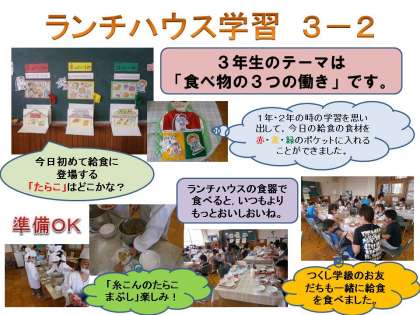 一緒に給食を食べた3年生は,電子紙芝居「給食室からこんにちは」で,みそ汁に「みょうが」が使われていることを知って「えっ どこどこ,ほんまに入ってたん。」と残念ながら気づかない子どももいましたが,「入ってたやん,いい香りと,食べた時シャキシャキしてたで」と,しっかり味わってくれている子どももたくさんいました。