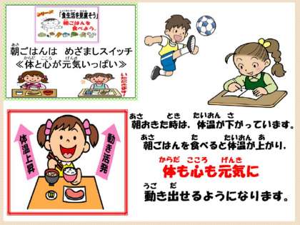 朝ごはんは,心を元気にしてくれます。また,一日の学習の効果を上げることにもなります。毎日しっかり食べて学校に送り出してください。