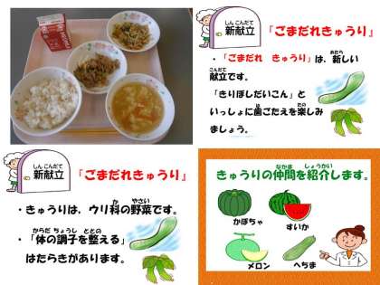 今日の給食は,旬の野菜「ゴーヤ」と「きゅうり」が登場しました。